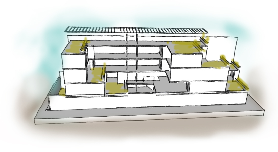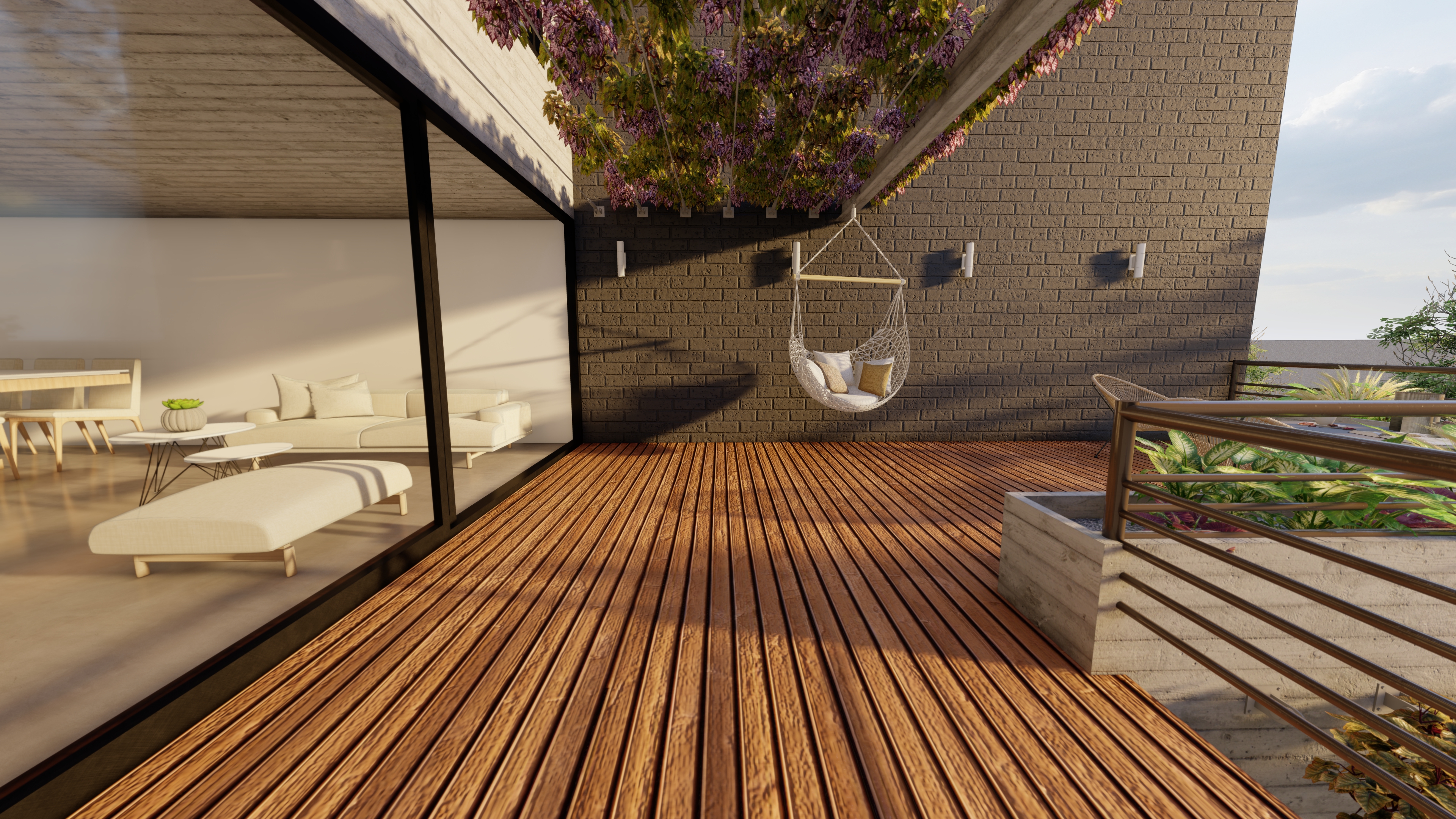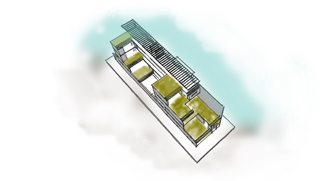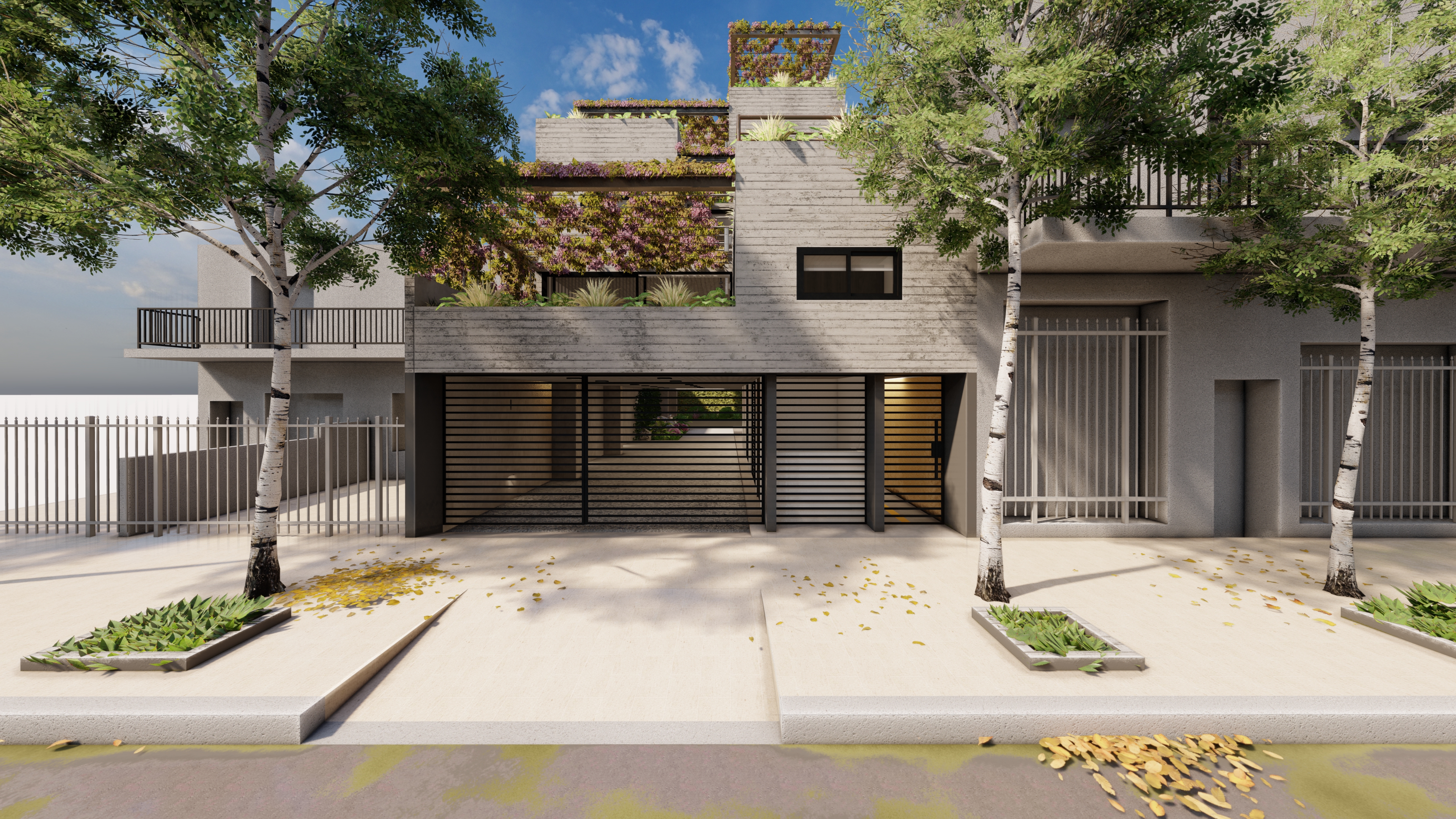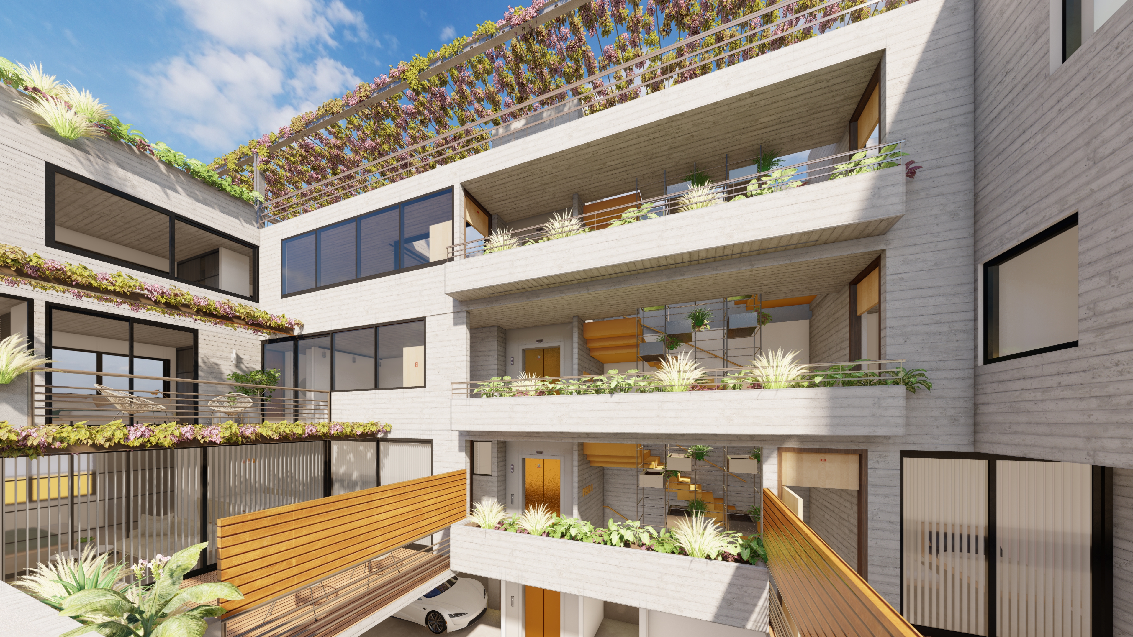 Son 6 casas en altura, donde los patios y la materialidad generan ritmo y fluidez espacial