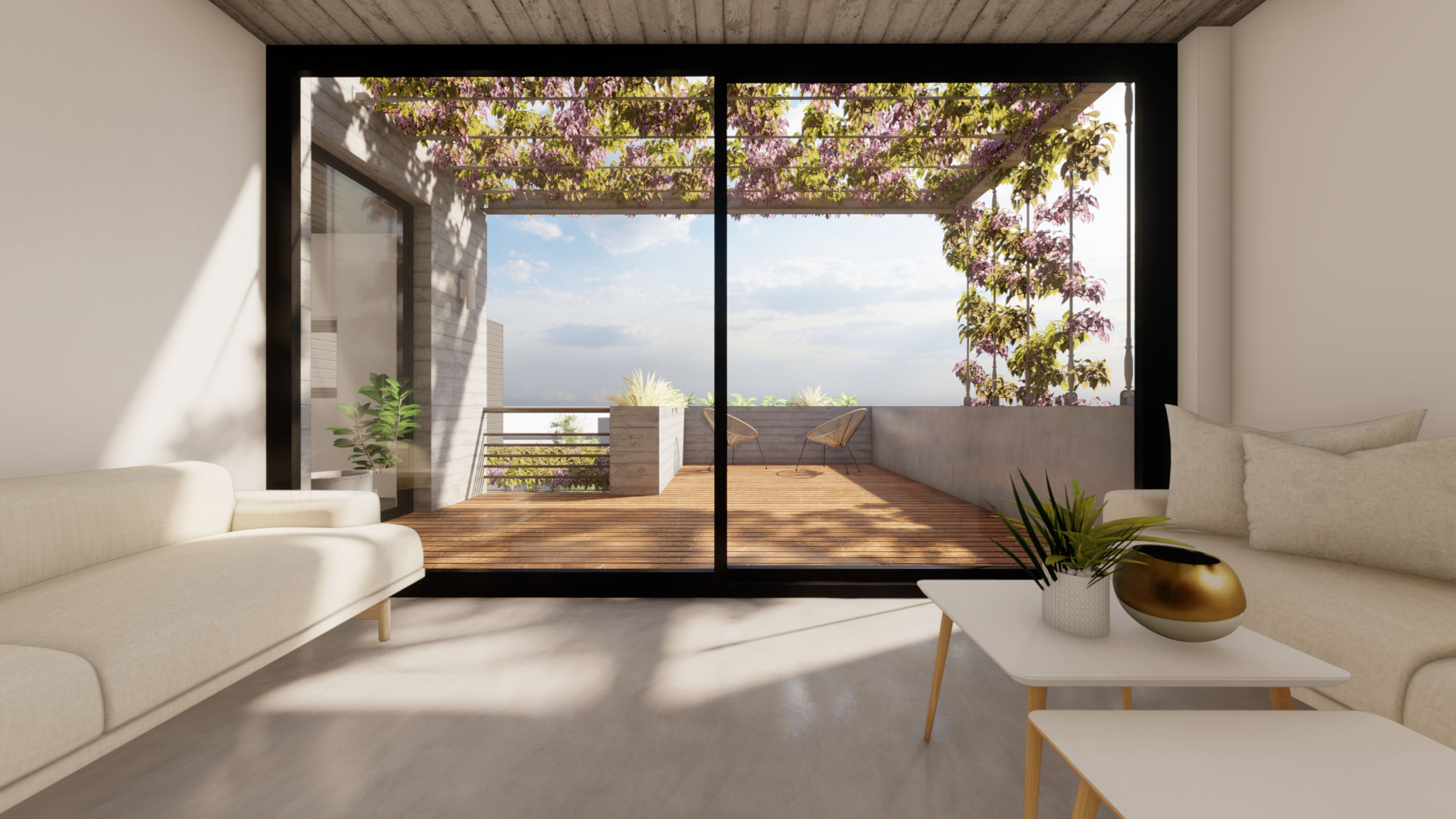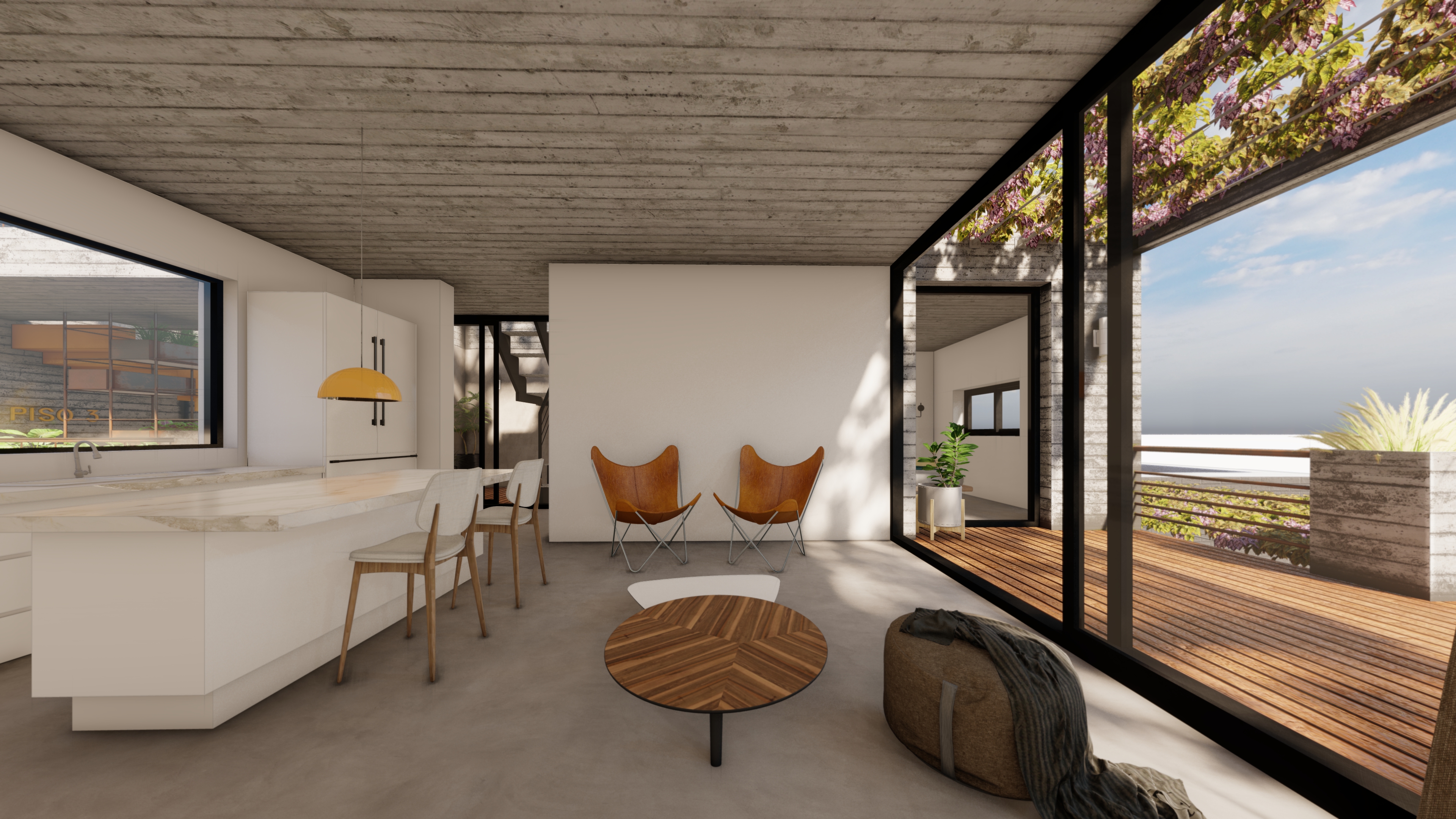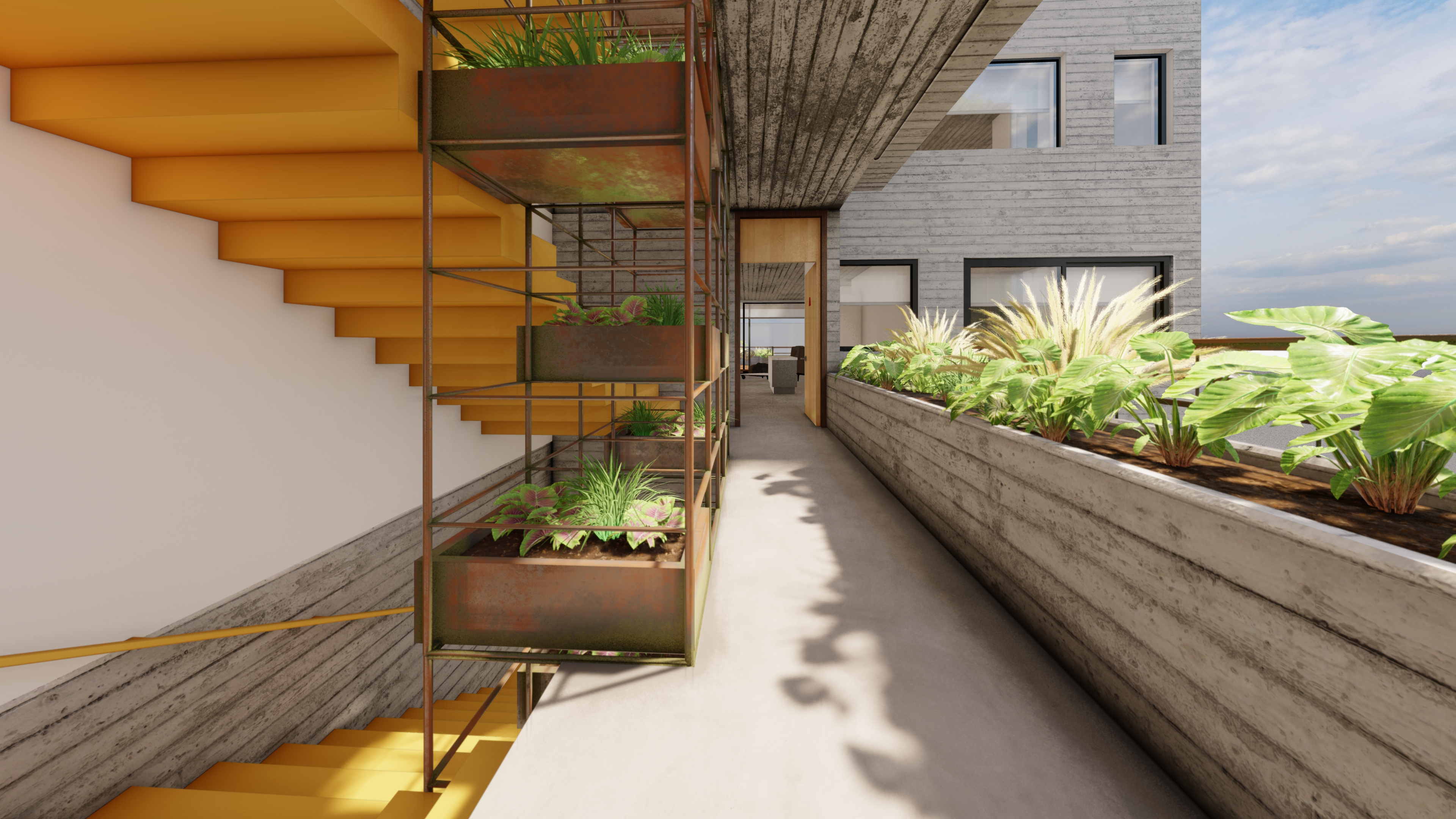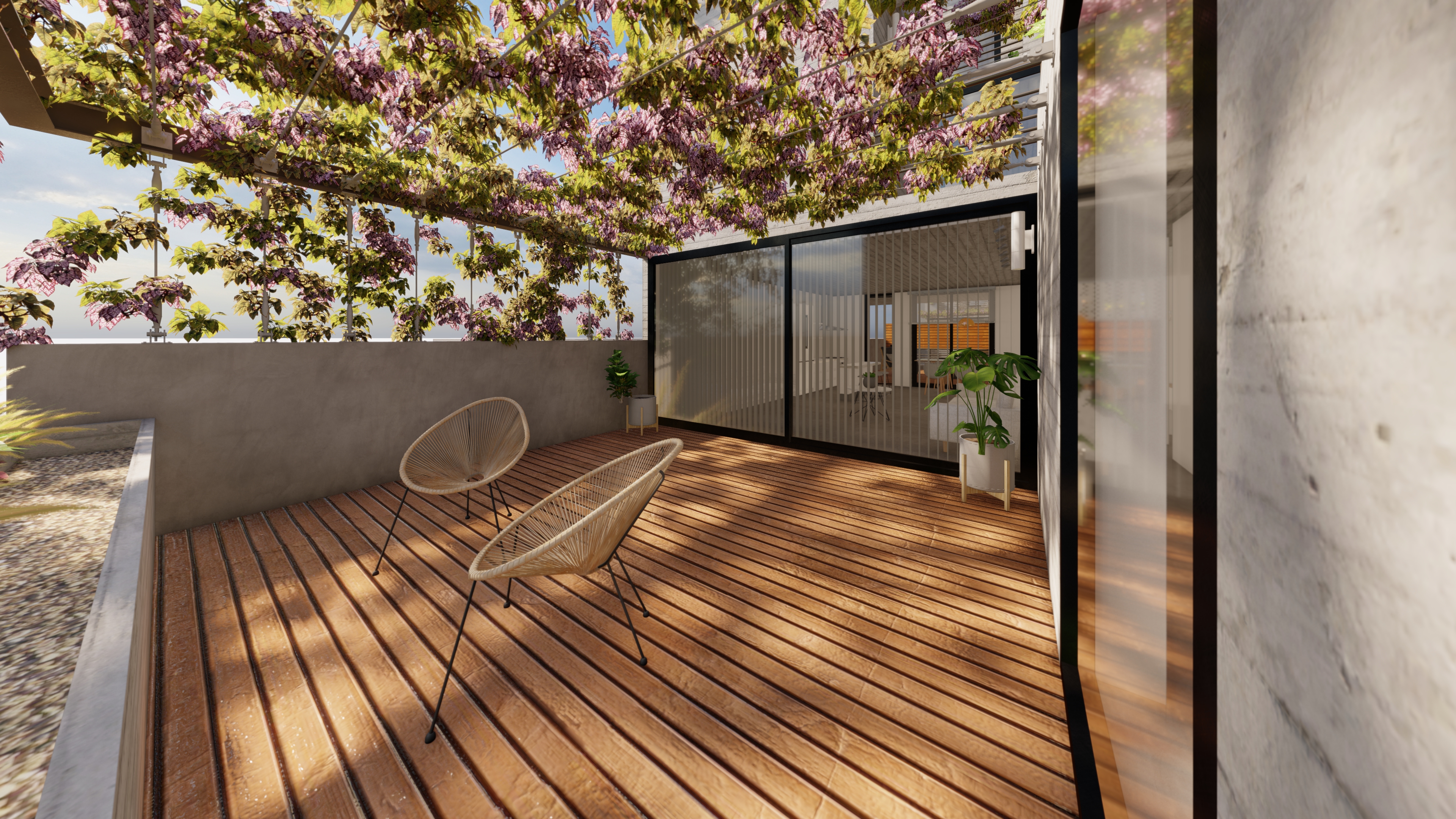 Las unidades se vinculan entre sí a través de un patio central semiprivado que ordena el uso comunitario, se abre a las visuales externas y genera las conexiones para los diferentes ingresos del sol.